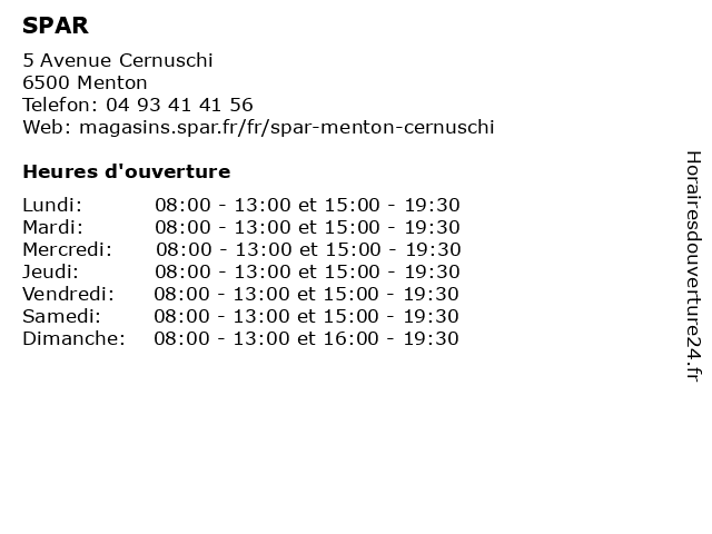 1 Spar (Distance: 0,93 km) - Promenade du Marchal leclerc, 06500 Menton alimentation, légumes et de fruits, spar, épicerie 2 SPAR (Distance: 7,29 km) 7 PLACE D'ARMES, 98000 MONACO alimentation, légumes et de fruits, spar, épicerie 3 SPAR (Distance: 13,28 km) 2 Route Nationale, 06440 L'Escarène alimentation, légumes et de fruits, spar, épicerie 4 Spar (Distance: 17,76 km) 81 Boulevard Léon Sauvan, 06690 Tourrette Levens alimentaire, alimentation, courses, spar, supermarché, supérette, épicerie 5 Spar (Distance: 18,35 km) 141 Avenue du Maréchal Luautey, 06300 Nice alimentation, légumes et de fruits, spar, épicerie 6 SPAR (Distance: 18,38 km) 51-53 Avenue Reine Victoria, 06000 Nice alimentation, légumes et de fruits, spar, épicerie |