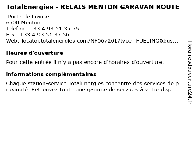 | Appeler TotalEnergies - RELAIS MENTON GARAVAN ROUTE | |