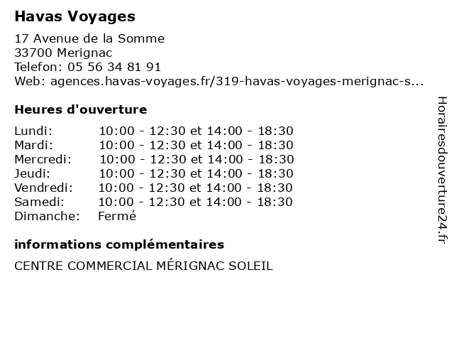 1 Havas Voyages (Distance: 6,52 km) 52 Allées de Tourny, 33000 Bordeaux agence, havas, organisation, séjours, tourisme, voyage, voyages 3 Carrefour Voyages (Distance: 0,14 km) 17 Avenue de la Somme, 33700 Mérignac agences, carrefour, location, vacances, voyages 4 Selectour - Gérard Pons Voyages (Distance: 2,27 km) 55 Avenue de la Libération, 33110 Le Bouscat billets de train, gérard, pons, selectour, séjours, vols, voyage, voyages 5 Look Voyages (Distance: 3,31 km) 24 avenue Jean Jaurès, 33600 Pessac agence, billet d'avion et hôtel pour votre club, look, séjour, voyage, voyages 6 Jetset Voyages / OnParOu.Com (Distance: 3,33 km) 9 Rue Laplace, 33700 Merignac agence, billet d'avion et hôtel pour votre club, jetset, onparou.com, séjour, voyages |