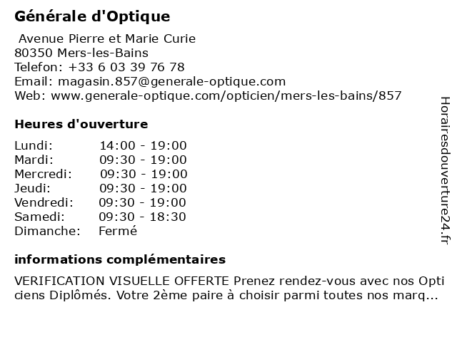 1 Opticien MERS LES BAINS Générale d'Optique (Distance: 0,01 km) Avenue Pierre et Marie Curie, 80350 Mers-les-Bains bains, d'optique, examen de la vue, générale, lentilles de contact, lentilles progressives, les, lunette ray ban, lunettes, lunettes anti-lumière bleue, lunettes de conduite de nuit, lunettes de conduites de nuit, lunettes de soleil, lunettes de soleil pour enfant, lunettes de soleil pour femme, lunettes de soleil pour homme, lunettes de vue, lunettes de vue femme, lunettes de vue homme, lunettes progressives, mers, opticien, opticien proche de chez moi, optique, sport à la vue, vérification de la vue 2 Dr.Richard Dewavrin- Médecine générale (Distance: 1,38 km) 7 Rue Menessier, 83150 Mers-les-Bains consultation, dewavrin, docteur, dr.richard, générale, médecine, santé 3 Cabinet Médical Mennessier - Médecine générale (secrétariat) (Distance: 1,38 km) 7 Rue Menessier, 83150 Mers Les Bains cabinet, consultation, docteur, générale, mennessier, médecine, médical, santé, secrétariat 4 Société Générale (Distance: 1,52 km) 5 Rue duhornay, 76260 Eu association d'épargne et de crédit, atm, conseil en crédit, générale, organisme d'assurance auto, organisme d'assurance moto, organisme d'assurance-habitation, organisme d'assurance-vie, société 5 Ael Electricité Générale SARL (Distance: 2,27 km) 5 Chemin de Saint-Rémy, 76260 Eu ael, electricité, générale, sarl 6 Dr.Bruno Fummi- Médecine générale (Distance: 5,37 km) 9 rue de l'Egalité, 76260 Saint Pierre en Val consultation, docteur, dr.bruno, fummi, générale, médecine, santé |