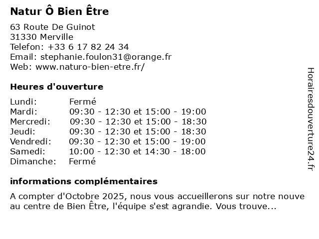 | Mercredi | 09:30-12:30 et 15:00-18:30 |