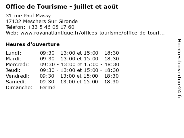 1 Office de Tourisme - juillet et août (Distance: 5,93 km) 12 rue Autrusseau, 17110 St Georges De Didonne août, de, et, horaires des musées, juillet, office, restaurants, tourisme, transports 2 Office de Tourisme - juillet et août (Distance: 13,18 km) 22 A Place du Général de Gaulle, 17600 Saujon août, de, et, horaires des musées, juillet, office, restaurants, tourisme, transports 3 Office de Tourisme - Juillet et août (Distance: 14,03 km) 1 avenue de la République, 17420 St Palais Sur Mer août, de, et, horaires des musées, juillet, office, restaurants, tourisme, transports 4 Office de Tourisme - juillet et août (Distance: 17,57 km) 5 route de Plordonnier, 17113 Mornac Sur Seudre août, de, et, horaires des musées, juillet, office, restaurants, tourisme, transports 5 Office de Tourisme - juin et septembre (Distance: 0,00 km) 31 rue Paul Massy, 17132 Meschers Sur Gironde de, et, horaires des musées, juin, office, restaurants, septembre, tourisme, transports 6 Office de Tourisme - octobre à mai (Distance: 0,00 km) 31 rue Paul Massy, 17132 Meschers Sur Gironde de, horaires des musées, mai, octobre, office, restaurants, tourisme, transports |
