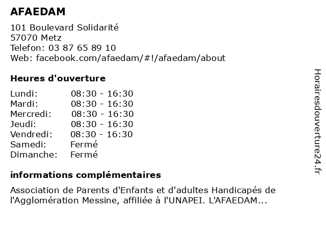 1 AFAEDAM - ESAT Solidarité (Distance: 0,99 km) 99 Boulevard Solidarité, 57070 Metz accueil, afaedam, aide, esat, hébergement, santé, social, solidarité, établissement 2 AFAEDAM - SESSAD Mosaik (Distance: 0,99 km) 97 Boulevard Solidarité, 57070 Metz accueil, afaedam, aide, hébergement, mosaik, santé, sessad, social, établissement 3 Afaedam - FAS Le Patio (Distance: 1,89 km) 8 rue du Pré Chaudron, 57070 Metz accueil, afaedam, aide, fas, hébergement, le, patio, santé, social, établissement 4 AFAEDAM - Clos Philippe Ricord (Distance: 6,54 km) - ZAC Mermoz, 57155 Marly accueil, afaedam, aide, clos, hébergement, philippe, ricord, santé, social, établissement 5 AFAEDAM - IME La Roseraie (Distance: 11,00 km) 21 rue du Bois de la Dame, 57130 Jussy accueil, afaedam, aide, hébergement, ime, la, roseraie, santé, social, établissement 6 AFAEDAM - ESAT (Distance: 16,40 km) - Moulin du Pont de Pierre, 57220 Varize accueil, afaedam, aide, esat, hébergement, santé, social, établissement |