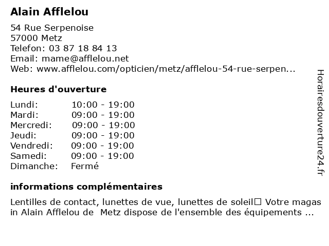 1 Alain Afflelou (Distance: 0,01 km) 54 rue Serpenoise, 57000 Metz accessoires, afflelou, alain, lentilles de contact, lunettes, opticien, optique 2 Alain Afflelou (Distance: 4,93 km) . Rue des Ponts, 54000 Nancy afflelou, alain, beaute, cafe, chaussures, enfants, mode femmes, mode hommes, restaurant, sport 3 Alain Afflelou (Distance: 8,94 km) Centre Commercial Auchan, 57280 Semécourt afflelou, alain, magasin de lunettes de soleil, magasin d’accessoires de mode, optométrie 4 Dr Alain Bresson - Radiologue (Distance: 0,88 km) 2 rue Belle Isle, 57045 Metz alain, belle, bresson, diagnostique, dr, hôpital, imagerie, isle, radiologie, radiologue, thérapeutique 5 Dr Alain Six - Chirurgien urologue (Distance: 0,88 km) 2 rue Belle Isle, 57045 Metz alain, andrologie, andrologue, belle, chirurgien, dr, hôpital, isle, six, urologique, urologue 6 Medecin Alain Aisene (hépatologue) (Distance: 1,39 km) 6 Rue de Pont-a-Mousson, 57000 Metz aisene, alain, docteur, hépatologue, medecin, sante, services |
