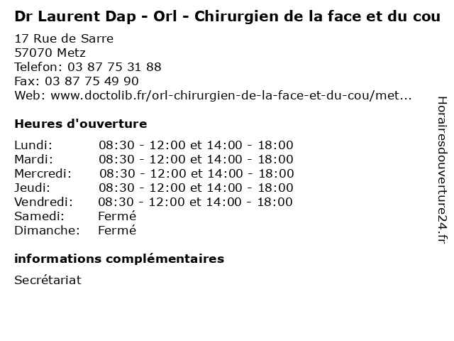 1 Dr Jean-Claude Debra - ORL - Chirurgien de la face et du cou (Distance: 0,00 km) 17 Rue de Sarre, 57070 Metz chirurgien, claude, cou, de, debra, dr, du, et, face, jean, la, laryngologie, orl, oto, rhino 2 Medecin Laurent Bahe (Chirurgien Plasticien) (Distance: 1,64 km) 97 Rue Claude Bernard, 57075 Metz bahe, chirurgien, docteur, laurent, medecin, plasticien, sante, services 3 Dr Dino Caprio - ORL - Chirurgien de la face et du cou (Distance: 1,67 km) 97 Rue Claude Bernard, 57070 Metz caprio, chirurgie, chirurgien, cou, de, dino, dr, du, et, face, general, la, orl, soins 4 Dr Dominique Trendel - ORL (Distance: 3,32 km) 5 Boulevard de Trèves, 57070 Metz dominique, dr, laryngologie, orl, oto, rhino, trendel 5 Dr Jean-Paul Barberot - Médecin ORL (Distance: 4,60 km) 2 rue Belle Isle, 57045 Metz barberot, belle, dr, hôpital, isle, jean, laryngologie, médecin, orl, oto, paul, rhino 6 Dr Renaud Beurton - Médecin ORL (Distance: 4,60 km) 2 rue Belle Isle, 57045 Metz belle, beurton, dr, hôpital, isle, laryngologie, médecin, orl, oto, renaud, rhino |