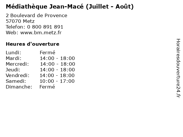 1 Médiathèque Jean-Macé (Distance: 0,00 km) 2 Boulevard de Provence, 57070 Metz bibliothèque, jean, livre, macé, médiathèque, services 2 Bibliothèque de Bellecroix (Juillet - août) (Distance: 2,02 km) 13 Rue de Toulouse, 57070 Metz août, bellecroix, bibliothèque, de, juillet, livre, médiathèque, services 3 Château de Malbrouck - du 1er juillet au 31 août (Distance: 3,44 km) 1 Rue du Pont Moreau, 57036 Metz 1er, 31, ancien, août, art, au, chateau, château, de, du, juillet, malbrouck, musee 4 Médiathèque Verlaine (Juillet - Août) (Distance: 3,47 km) . Place de la Bibliothèque, 57000 Metz août, bibliothèque, juillet, livre, médiathèque, services, verlaine 5 Médiathèque du Sablon (Juillet - Août) (Distance: 3,85 km) 4/6 Rue des Robert, 57000 Metz août, bibliothèque, du, juillet, livre, médiathèque, sablon, services 6 Bibliothèque de la Patrotte (Juillet - Août) (Distance: 4,92 km) 4 Rue Paul Chevreux, 57050 Metz août, bibliothèque, de, juillet, la, livre, médiathèque, patrotte, services |