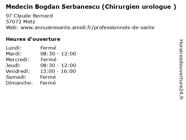 1 Medecin Bogdan Serbanescu - Horaires du Cabinet (Chirurgien urologue ) (Distance: nan km) 97 Claude Bernard, 57072 Metz bogdan, cabinet, chirurgien, docteur, du, horaires, medecin, sante, serbanescu, services, urologue 2 Dr Benoit Laplace - Chirurgien urologue (Distance: 1,59 km) 11 Rue de Sarre, 57070 Metz benoit, chirurgie, chirurgien, dr, general, laplace, soins, urologue 3 Medecin Christophe Hanss (Allergologue) (Distance: 2,30 km) 17 Rue Haute Seille, 57000 Metz allergologue, christophe, docteur, hanss, medecin, sante, services 4 Medecin Jean Paul Giradeau (Acupuncteur) (Distance: 2,51 km) 20-22 Rue de Ladoucette, 57000 Metz acupuncteur, docteur, giradeau, jean, medecin, paul, sante, services 5 Medecin Philippe Hoefler (Pathologiste) (Distance: 2,53 km) 21 Rempart, 57000 Metz docteur, hoefler, medecin, pathologiste, philippe, sante, services 6 Dr Etienne Barbier - Chirurgien urologue (Distance: 3,10 km) 2 rue Belle Isle, 57045 Metz andrologie, andrologue, barbier, belle, chirurgien, dr, etienne, hôpital, isle, urologique, urologue |