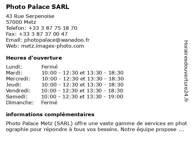 | Samedi | 10:00-12:30 et 13:30-19:00 |