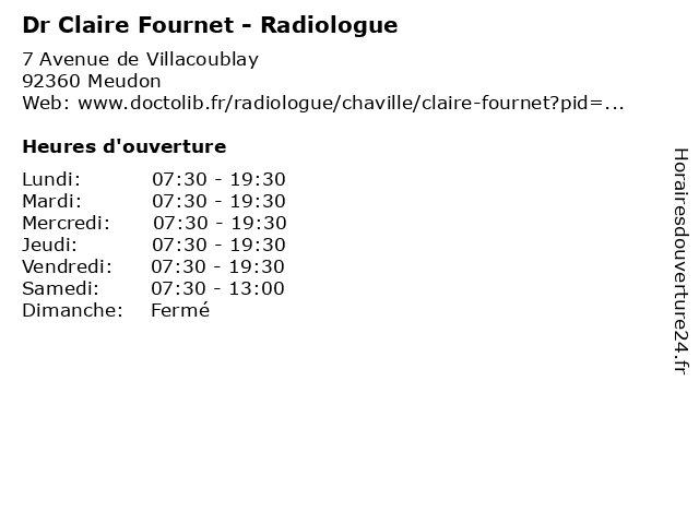 1 Dr Claire Fournet - Radiologue (Distance: 0,00 km) 3 Avenue de Villacoublay, 92360 Meudon claire, diagnostique, dr, fournet, imagerie, radiologie, radiologue, thérapeutique 2 Dr Claire Fournet - Radiologue (Distance: 3,40 km) 86 Avenue Jean Jaurès, 92140 Clamart claire, consultation, docteur, dr, fournet, med, médecin, radiologue, traitement 3 Dr Claire Fournet - Radiologue (Distance: 4,38 km) 855 Avenue Roger Salengro, 92370 Chaville claire, consultation, docteur, dr, fournet, med, médecin, radiologue, traitement 4 Dr Claire Fournet - Radiologue (Distance: 5,30 km) 32 Rue Diderot, 92130 Issy-les-Moulineaux claire, consultation, docteur, dr, fournet, med, médecin, radiologue, traitement 5 Dr Claire Fournet - Radiologue (Distance: 5,90 km) 31 Rue Ernest Renan, 92130 Issy-les-Moulineaux claire, consultation, docteur, dr, fournet, med, médecin, radiologue, traitement 6 Claire's (Distance: 9,31 km) 22 Rue du Départ, 75015 Paris beaute, cafe, chaussures, claire's, enfants, mode femmes, mode hommes, restaurant, sport |