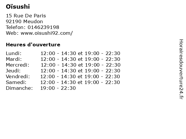 | Lundi | 12:00-14:30 et 19:00-22:30 |