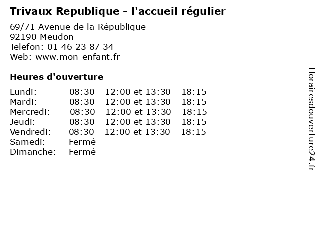 | Mardi | 08:30-12:00 et 13:30-18:15 |