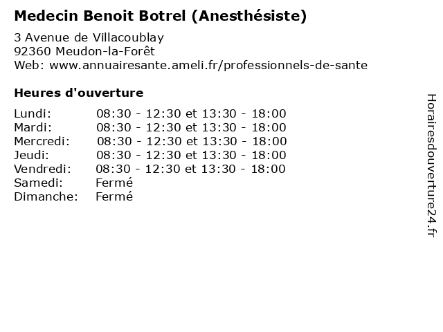 | Lundi | 08:30-12:30 et 13:30-18:00 |