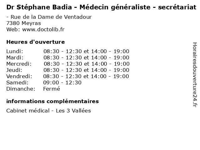 | Mercredi | 08:30-12:30 et 14:00-19:00 |