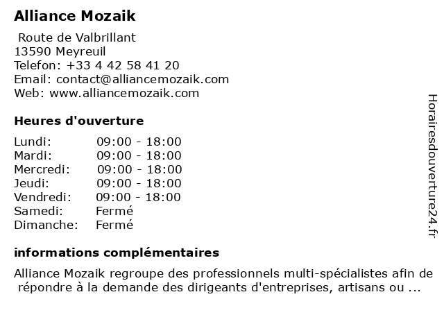 1 Alliance Française Aix-Marseille Provence (Distance: 7,50 km) 4 place Barthélémy Niollon, 13100 Aix-en-Provence aix, alliance, formation, francophone, française, langues, marseille, provence, Écoles 3 Ecole Primaire Protestante La Nouvelle Alliance (Distance: 8,38 km) - Allée du Docteur Bianchi, 13090 Aix-en-Provence alliance, cio, coeur, collège, ecole, enseignement, garderie, jean, la, lycée, marie, maternelle, monteillet, nationale, nouvelle, orientation, primaire, privé, privée, protestante 4 Alliance Experts (Distance: 8,97 km) 840 Avenue du Camp de Menthe, 13090 Aix-en-Provence alliance, experts 5 Alliance Experts - Cabinet (Distance: 9,04 km) 840 Avenue du camp de menthe, 13090 Aix-en-provence accidentologie, alliance, automobile, cabinet, du, d’ouverture, endommagé, expertise, experts, horaires, maritime, voiture, véhicule 6 ALLIANCE PISCINES AIX (Distance: 9,77 km) Avenue Maréchal de Lattre de Tassigny, 13090 Aix-en-Provence aix, alliance, piscines |