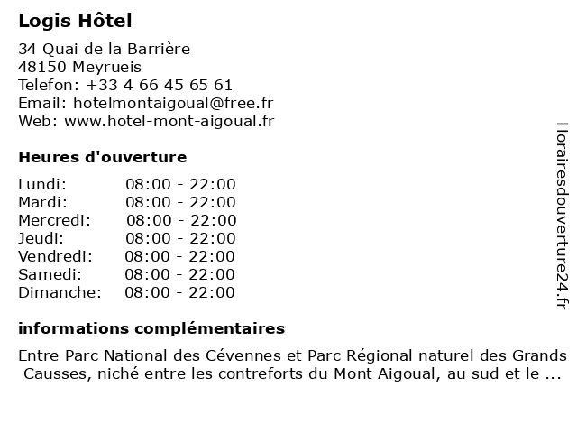 1 Hôtel les Sapins (Distance: 0,14 km) 2 rue de Monseigneur Henry Marret, 48150 Meyrueis garage, hôtel, jardin, les, rénovée, sapins, terrasse 2 Hôtel de l'Europe (Distance: 0,16 km) 2 Quai Barrière, 48150 Meyrueis de, hotel, hôtel, jardin, l'europe, parking, piscine, restaurant, wi-fi 3 Ass Régionale Formation Aigoual (Distance: 5,70 km) Route Des Mazes, 30750 Lanuéjols aigoual, ass, formation, régionale 4 Hôtel Restaurant de la Jonte - Les Douzes (Distance: 11,28 km) - Lieu-dit Les Douzes, 48150 Hures-la-Parade chambre, de, douzes, hôtel, jonte, la, les, restaurant, restauration 5 Communauté de Communes Causse Aigoual Cevennes (Distance: 12,87 km) . L’Ésperou, 30570 Valleraugue administration, aigoual, causse, cevennes, communauté, communes, de, services publics 6 Hôtel Doussière - Restaurant L'Alicanta (Distance: 17,60 km) n/c Route de Meyrueis, 48150 Le Rozier alicanta, doussière, hôtel, l'alicanta, restaurant, restaurants, restauration, séjour |