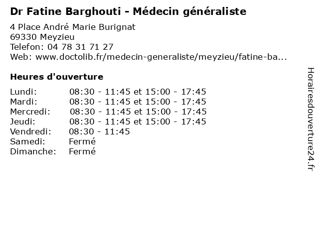 1 Dr Mariam Guilhem-Noureddine - Médecin généraliste (Distance: 0,00 km) 4 Place André Marie Burignat, 69330 Meyzieu docteur, dr, generaliste, guilhem, généraliste, mariam, medical, médecin, noureddine, soin 2 Dr Sophie Pelloux - Médecin généraliste (Distance: 0,00 km) 4 Place André-marie Burignat, 69330 Meyzieu consultation, docteur, dr, généraliste, med, médecin, pelloux, sophie, traitement 3 Efféa (Distance: 0,06 km) 3 Allee Joannes Gonon, 69330 Meyzieu alimentation, cosmétiques, efféa, soins 4 Dr Damien Burguion - Médecin généraliste (Distance: 0,08 km) 54 ter Rue de la République, 69330 Meyzieu burguion, consultation, damien, docteur, dr, généraliste, med, médecin, traitement 5 Aude Martin - Hypnothérapeute (Distance: 0,09 km) 41 Rue de la République, 69330 Meyzieu aude, hypnose, hypnotherapeute, hypnothérapeute, martin, sante, soins 6 Fouzia Bitam - Hypnothérapeute (Distance: 0,09 km) 41 Rue de la République, 69330 Meyzieu bitam, fouzia, hypnose, hypnotherapeute, hypnothérapeute, sante, soins |
