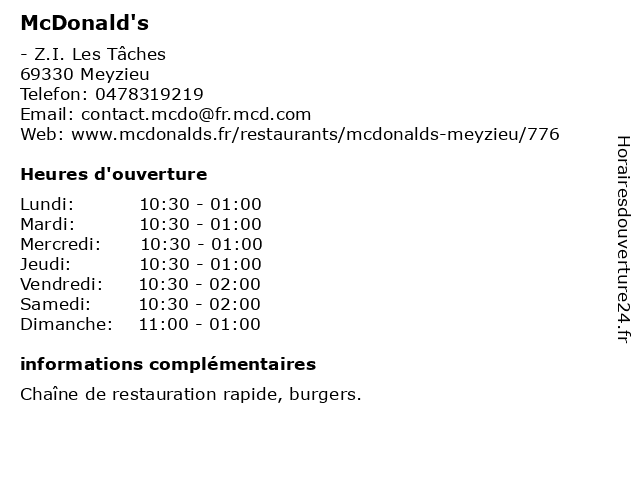 1 McDonald's (Distance: 4,73 km) - Rue Antoine Pinay, 69740 Genas burgers, fast, food, hamburgers, mcdonald's, rapide, restaurant, restauration 2 McDonald's (Distance: 7,03 km) 149 avenue Charles de Gaulle, 69720 Saint-Bonnet-de-Mure burgers, fast, food, hamburgers, mcdonald's, rapide, restaurant, restauration 3 McDonald's (Distance: 7,22 km) - Avenue Jean Jaurès, 69150 Décines-Charpieu burgers, fast, food, hamburgers, mcdonald's, rapide, restaurant, restauration 4 McDonald's (Distance: 7,73 km) - Rue des Frères Lumière, 69120 Vaulx-en-Velin burgers, fast, food, hamburgers, mcdonald's, rapide, restaurant, restauration 5 McDonald's (Distance: 7,80 km) - ZAC des Baterses, 01700 Beynost burgers, fast, food, hamburgers, mcdonald's, rapide, restaurant, restauration 6 McDonald's (Distance: 12,10 km) - Route De Crémieu, 38230 Tignieu-Jameyzieu burgers, fast, food, hamburgers, mcdonald's, rapide, restaurant, restauration |