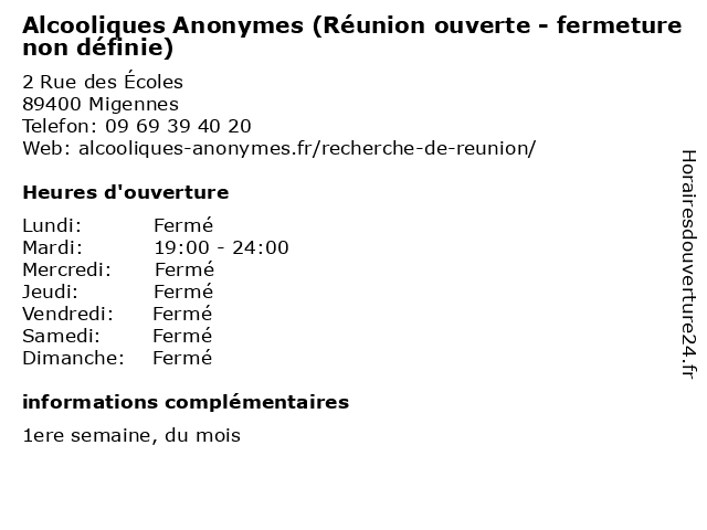 Termes de recherche pour Alcooliques Anonymes (Réunion ouverte - fermeture non définie):reunion, non, fermeture, ouverte, alcooliques, anonymes, définie |