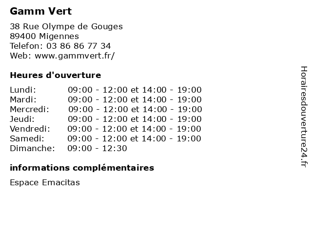 | Samedi | 09:00-12:00 et 14:00-19:00 |