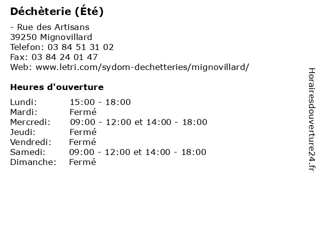 1 Déchèterie (Été) (Distance: 7,71 km) - ZI du Lhotaud, 25560 Frasne bennes, débarras, déchèterie, détritus, ordures, été 2 Déchèterie (Hiver) (Distance: 0,00 km) - Rue des Artisans, 39250 Mignovillard déchets, déchèterie, dépôts, gravats, hiver, sélectif, tri 3 Déchèterie (Distance: 5,19 km) - Route de Cerniébaud, 39250 Mignovillard déchèterie, gravats, huiles usées, la réception des déchets et écocentres, les appareils électroménagers, les déchets verts, papier et carton en quantité 4 Déchèterie (Hiver ) (Distance: 10,35 km) - Grande Rue, 25240 Mouthe déchèterie, gravats, hiver, huiles usées, la réception des déchets et écocentres, les appareils électroménagers, les déchets verts, papier et carton en quantité 5 Déchèterie (Eté) (Distance: 13,55 km) - lieu-dit La Fuvelle, 25160 Labergement-Sainte-Marie bennes, débarras, déchèterie, détritus, eté, ordures, été 6 Déchèterie (du 01/11 au 31/03) (Distance: 16,88 km) - La Fuvelle, 25160 Labergement-Sainte-Marie 01/11, 31/03, au, du, déchèterie, gravats, huiles usées, la réception des déchets et écocentres, les appareils électroménagers, les déchets verts, papier et carton en quantité |