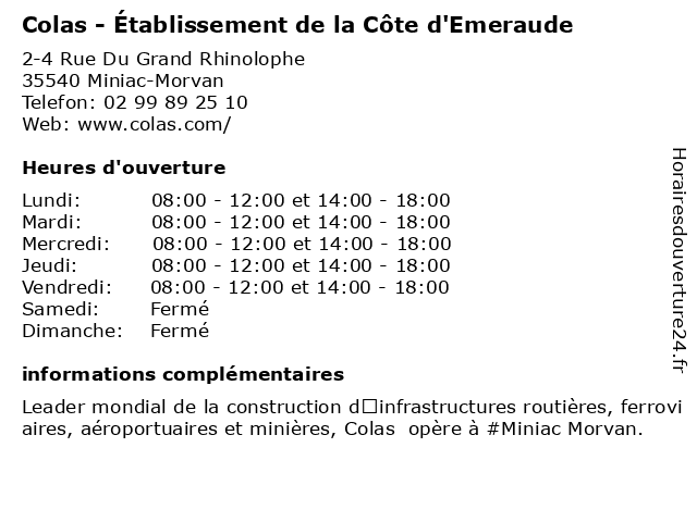 2 Colas (Distance: 0,89 km) 1 impasse Du Sarrazin, 35540 Miniac-Morvan colas, conception, construction, entretien, public, réalisation, travaux 3 Constructions de la Côte d'Emeraude (Distance: 1,67 km) La Costardais, 22690 Pleudihen-sur-Rance constructions, côte, d'emeraude, de, la 4 L'Emeraude Club Privé Libertin (Distance: 1,85 km) 1 ZA de Doslet, 35430 Châteauneuf d'Ille et Vilaine alcool, ambiance, amis, boissons, club, danse, discotheque, electro, jeux, l'emeraude, libertin, privé, rencontre, shot, themes 6 EMERAUDE RAMONAGE DESINSECTISATION (Distance: 7,36 km) 5 La ville Malherbe, 35430 Saint-Père-Marc-en-Poulet desinsectisation, emeraude, ramonage |