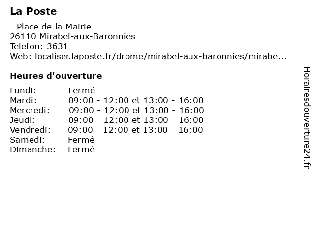1 La Poste (Distance: 0,02 km) - Place de la Mairie, 26110 Saint-Maurice-sur-Eygues agence, assurance, banque, banque postale, bureau de poste, chronopost, colis, courrier, dps, expéditions internationales, la, point, postale, poste, relais, timbres, téléphonie, ups, western union 2 La Poste (Distance: 0,19 km) 3 Rue du Mont Angele, 26110 Vinsobres agence, assurance, banque, banque postale, bureau de poste, chronopost, colis, courrier, dps, expéditions internationales, la, point, postale, poste, relais, timbres, téléphonie, ups, western union 4 La Poste (Distance: 5,90 km) 13 Passage du Villadei, 84110 Villedieu agence, assurance, banque, banque postale, bureau de poste, chronopost, colis, courrier, dps, expéditions internationales, la, point, postale, poste, relais, timbres, téléphonie, ups, western union 6 La Poste (Distance: 10,28 km) 1 Route buisson, 84290 St roman de malegarde la, la poste, poste, st roman de malegarde |
