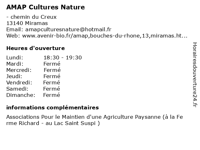 1 AMAP les Jardins de Cidamos (Distance: 5,44 km) - sur le port, 13250 Saint-Chamas amap, bio, cidamos, de, fruits, jardins, legumes, les, primeur, producteur 2 AMAP Cravenco d’Entressen (Distance: 5,95 km) - Rue de Couliès, 13118 Entressen amap, bio, cravenco, d’entressen, fruits, legumes, primeur, producteur, viandes 3 AMAP de Bel Air (Distance: 6,58 km) - Espace Citoyen de Bel Air, 13300 Salon-de-Provence air, amap, bel, bio, de, fruits, legumes, primeur, producteur, viandes 4 Poissonnerie Nature Marée (Distance: 8,99 km) 6 Boulevard Paul Painleve, 13800 Istres crustacé, maree, marée, nature, poissonnerie, poissonneries, poissons 5 AMAP Roustid’Istres (Distance: 9,65 km) - Chemin des Tartugues, 13800 Istres amap, bio, fruits, legumes, primeur, producteur, roustid’istres, viandes 6 AMAP Le Jardin d'Epicure (Distance: 11,30 km) - allée Marius Laugier, 13800 Istres amap, bio, d'epicure, fruits, jardin, le, legumes, primeur, producteur |