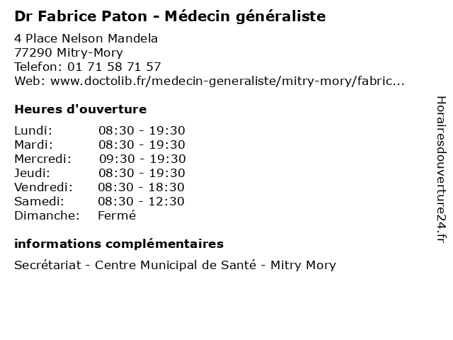 1 Fabrice Mingo - Hypnothérapeute (Distance: 1,01 km) 3 Place Pasteur, 77290 Mitry-Mory fabrice, hypno, hypnose, hypnothérapeute, mingo, sante 2 Fabrice Mingo - Hypnothérapeute (Distance: 6,50 km) 62 Rue Maximilien Robespierre, 93600 Aulnay-sous-Bois fabrice, hypno, hypnose, hypnothérapeute, mingo, sante 3 Vieira Fabrice (Distance: 10,66 km) 49 Rue Aux Reliques, 77410 Annet Sur Marne fabrice, restaurants, vieira 4 Fabrice Canthelou - Ostéopathe (Distance: 12,27 km) 28 Rue Joliot Curie, 93330 Neuilly-sur-Marne actes et symptômes, canthelou, expertises, fabrice, ostéopathe, ostéopathie du sport, ostéopathie pédiatrique 5 Jean Louis Fabrice (Distance: 14,12 km) 167 Avenue Du Marechal Joffre, 94170 Le Perreux Sur Marne fabrice, jean, louis, restaurants 6 Rethore Fabrice Gilbert Laurent (Distance: 14,77 km) 38 Rue De Champagne, 77600 Bussy St Martin alimentation, divers, fabrice, gilbert, laurent, magasins, rethore |