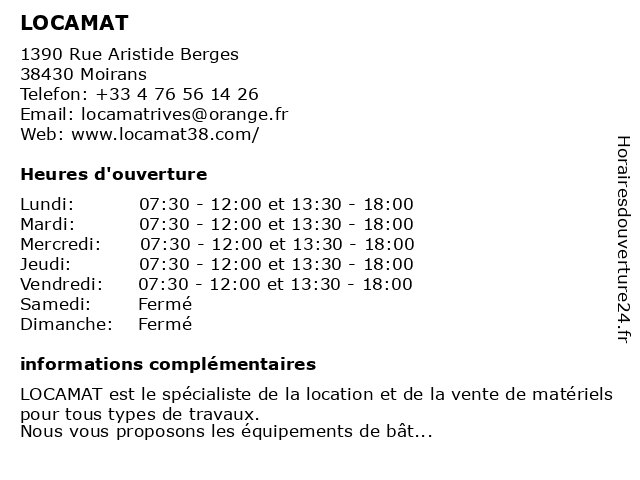 2 Locamat (Distance: 9,73 km) 88 Rue des Emptes, 38140 Rives locamat, location, matériel, nettoyage, pneumatique, signalisation, transport |