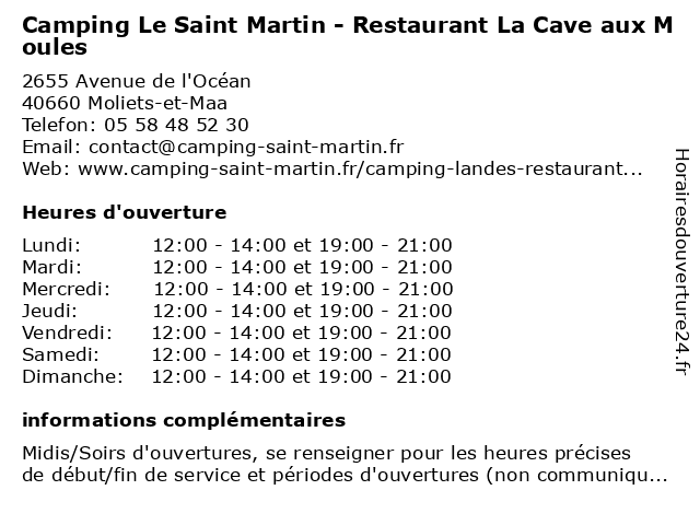 1 Camping Le Saint Martin (Distance: nan km) 2655 Avenue de l'Océan, 40660 Moliets-et-Maa camping, hebergement, le, martin, saint, tourisme 2 Camping Le Saint Martin - Bar Crêperie La Cafetière (Distance: nan km) 2655 Avenue de l'Océan, 40660 Moliets-et-Maa bar, cafetière, camping, crêperie, hebergement, la, le, martin, saint, tourisme 3 Camping Le Saint Martin - Restaurant a Table de l'Océan (Distance: nan km) 2655 Avenue de l'Océan, 40660 Moliets-et-Maa camping, de, hebergement, l'océan, le, martin, restaurant, saint, table, tourisme 4 Camping Le Saint Martin - Réception (Distance: nan km) 2655 Avenue de l'Océan, 40660 Moliets-et-Maa camping, hebergement, le, martin, réception, saint, tourisme 5 Aux Delices Des Saisons (Distance: 7,30 km) Moisane Commerce 2 Residence, 40480 Vieux Boucau Les Bains aux, delices, restaurants, saisons 6 Aux Delices Des Saisons (Distance: 7,80 km) La Moisane Appartement 7 Residence, 40480 Vieux Boucau Les Bains aux, delices, restaurants, saisons |