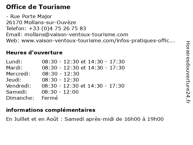 1 Point Info Tourisme - Avril à Juin (Distance: 4,75 km) 305 avenue des Princes d'Orange, 84340 Entrechaux 01/04, 30/06, au, avril, du, horaires des musées, info, juin, office, point, restaurants, tourisme, transports 2 Point Info Tourisme - 7 Juillet au 24 Août (Distance: 4,75 km) 305 avenue des Princes d'Orange, 84340 Entrechaux 07/07, 24, 24/08, août, au, du, horaires des musées, info, juillet, office, point, restaurants, tourisme, transports 3 Office de Tourisme - Vaison-la-Romaine (Ete) (Distance: 9,56 km) . Place Chanoine Sautel, 84110 Vaison-la-Romaine bureaux, de, ete, la, office, romaine, services, tourisme, vaison 4 Office de Tourisme - Vaison-la-Romaine (Printemps,Automne)) (Distance: 9,56 km) . Place Chanoine Sautel, 84110 Vaison-la-Romaine automne, bureaux, de, la, office, printemps, romaine, services, tourisme, vaison 5 Point Info Tourisme - Du 15 mai au 15 octobre (Distance: 14,01 km) 4 route de Vaison, 84110 Seguret 15, au, du, horaires des musées, info, mai, octobre, office, point, restaurants, tourisme, transports 6 Point Info Tourisme - Du 16 octobre au 14 mai (Distance: 14,01 km) 4 route de Vaison, 84110 Seguret 14, 16, au, du, horaires des musées, info, mai, octobre, office, point, restaurants, tourisme, transports |