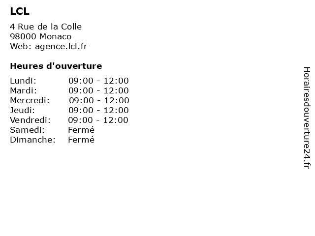 2 LCL (Distance: 0,96 km) 2 Avenue Princesse Alice, 98000 Monaco agence, assurance, bancaire, banque, lcl 3 LCL (Distance: 1,28 km) 2 Boulevard de la République, 06240 Beausoleil agence, assurance, bancaire, banque, lcl 5 LCL (Distance: 6,75 km) 2 Avenue du Général de Gaulle, 06500 Menton agence, assurance, bancaire, banque, lcl 6 LCL (Distance: 8,57 km) 33 Boulevard du Général de Gaulle, 06340 La Trinité agence, assurance, bancaire, banque, lcl |