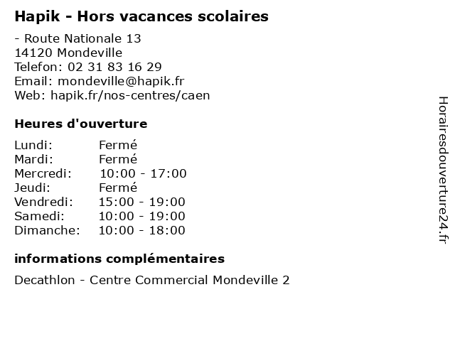 1 Hapik - Vacances scolaires et jours fériés (Distance: 0,00 km) - Route Nationale 13, 14120 Mondeville enfants, escalade, et, fériés, fêtes, hapik, jeux, jours, loisirs, murs, salle, scolaires, vacances 2 Service des Affaires Scolaires (Distance: 8,23 km) - place Barette, 27207 Vernon affaires, des, favoriser la scolarité des enfants, inscriptions scolaires, scolaires, service 3 Médiathèque Philippe-Auguste - Vacances Scolaires (Distance: 8,27 km) 12 avenue Victor-Hugo, 27200 Vernon auguste, cd, dvd, jeux videos, livres, médiathèque, philippe, revues, scolaires, vacances 4 Laser Game Evolution (Vacances scolaires) (Distance: 10,06 km) 6 rue de la croix blanche, 27950 Saint-Marcel evolution, game, jeux, laser, scolaires, vacances 5 Royal Kids (Vacances Scolaires) (Distance: 14,51 km) 1 rue des Gamelines, 78200 Buchelay enfants, horaires, kids, loisirs, parc, royal, scolaires, vacances 6 Royal Kids (Périodes Scolaires) (Distance: 14,51 km) 1 rue des Gamelines, 78200 Buchelay enfants, horaires, hors, kids, loisirs, parc, périodes, royal, scolaires, vacances |