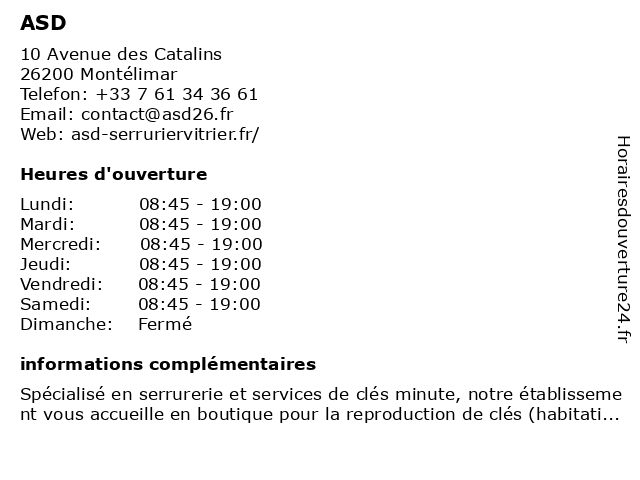 1 ASD Serrurier-Vitrier (Distance: 2,18 km) 8 allée des Baigneuses, 26200 Montélimar asd, dépannage, menuiserie, serrurier, serrurier/vitrier, vitrerie, vitrier |