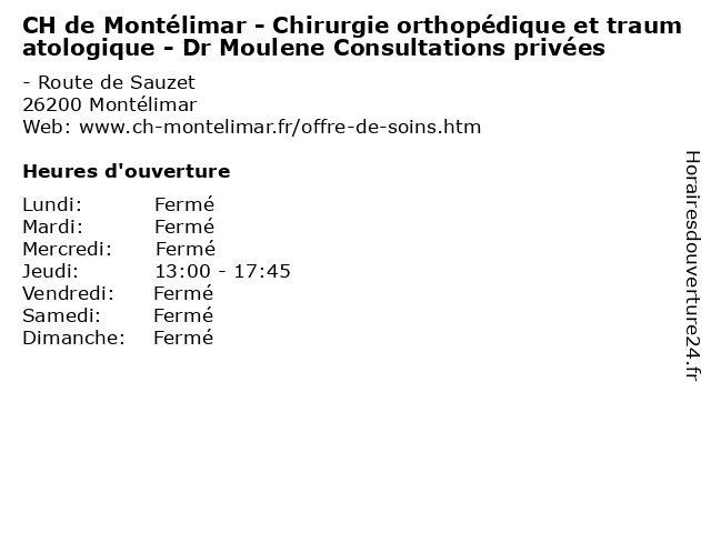 1 CH de Montélimar - Chirurgie orthopédique et traumatologique - Secrétariat consultations (Distance: 0,00 km) - Route de Sauzet, 26200 Montélimar bureau, ch, chirurgie, consultation, consultations, de, dr, et, maladie, med, montélimar, médecin, médecine, orthopédique, pratique, secrétariat, thérapie, traitement, traumatologique 2 CH de Montélimar - Chirurgie orthopédique et traumatologique - Horaires de consultations (Distance: 0,00 km) - Route de Sauzet, 26200 Montélimar bureau, ch, chirurgie, consultation, consultations, de, dr, et, horaires, maladie, med, montélimar, médecin, médecine, orthopédique, pratique, thérapie, traitement, traumatologique 3 CH de Montélimar - Chirurgie orthopédique et traumatologique - Consultation post-urgence (Distance: 0,00 km) - Route de Sauzet, 26200 Montélimar bureau, ch, chirurgie, consultation, de, dr, et, maladie, med, montélimar, médecin, médecine, orthopédique, post, pratique, thérapie, traitement, traumatologique, urgence 4 CH de Montélimar - Chirurgie orthopédique et traumatologique - Dr Moulene Consultations publiques (Distance: 0,00 km) - Route de Sauzet, 26200 Montélimar bureau, ch, chirurgie, consultation, consultations, de, dr, et, maladie, med, montélimar, moulene, médecin, médecine, orthopédique, pratique, publiques, thérapie, traitement, traumatologique 5 CH de Montélimar - Chirurgie ambulatoire secrétariat (Distance: 0,00 km) - Route de Sauzet, 26200 Montélimar ambulatoire, bureau, ch, chirurgie, consultation, de, dr, maladie, med, montélimar, médecin, médecine, pratique, secrétariat, thérapie, traitement 6 CH de Montélimar - Chirurgie générale et viscérale secrétariat (Distance: 0,00 km) - Route de Sauzet, 26200 Montélimar bureau, ch, chirurgie, consultation, de, dr, et, générale, maladie, med, montélimar, médecin, médecine, pratique, secrétariat, thérapie, traitement, viscérale |
