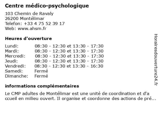 1 Centre médico-psychologique (Distance: 0,00 km) 103 Chemin de Ravaly, 26200 Montélimar centre, médico, psychologique 2 Centre médico-psychologique (Distance: 19,87 km) 496 Avenue Jean Moulin, 07700 Bourg-Saint-Andéol centre, médico, psychologique 3 Centre médico-psychologique et CATTP Le Fil de Soi (Distance: 19,87 km) 496 Avenue Jean Moulin, 07700 Bourg-Saint-Andéol cattp, centre, de, et, fil, le, médico, psychologique, soi 4 Centre Médico-Psychologique de LIVRON (Distance: 27,79 km) 74 Avenue Léon Aubin, 26250 Livron centre, de, docteur, livron, medecins, médico, psychologique, sante 5 Centre Médico-Psychologique de LIVRON (Distance: 27,82 km) 2 Rue Madier de Montjeau, 26250 Livron centre, de, docteur, livron, medecins, médico, psychologique, sante 6 Centre Médico-Psychologique pour Enfants du Crestois (Distance: 29,82 km) 7 Rue Prunet, 26400 Crest centre, crestois, docteur, du, enfants, medecins, médico, pour, psychologique, sante |