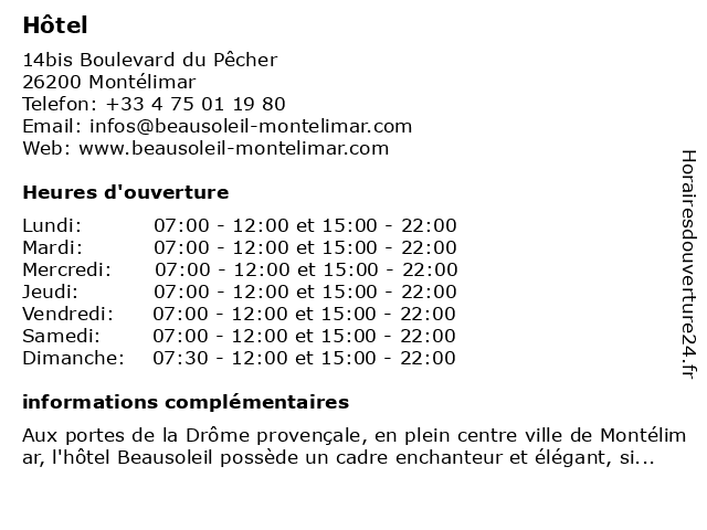1 Hôtel Kyriad (Distance: 0,13 km) 8 Boulevard Du Pecher, 26200 Montélimar bar, hotel, hôtel, kyriad, restaurant, service 2 Onepark / Hôtel de Ville Parking (Distance: 0,62 km) - Ru adhémar, 26200 Montelimar de, hôtel, onepark, parking, services, ville 3 Hôtel L'Hostellerie des Pins - Réception (Inter-Hôtel) (Distance: 2,29 km) 148 Route de Marseille, 26200 Montélimar des, hebergement, hotel, hôtel, inter, l'hostellerie, pins, réception 4 Hôtel Médiéval (Inter-Hôtel) (Distance: 4,48 km) - Rue de l'Averse, 07400 Rochemaure accès, hebergement, hotel, hôtel, inter, médiéval 5 Hôtel Campanile (Distance: 12,22 km) n/a Za Hoteliere Les Tourrettes, 26740 Les Tourrettes bar, campanile, hotel, hôtel, restaurant, réunions, évenements 6 B&B Hôtel (Distance: 12,25 km) 650 rue de Bérianne, 26740 Les Tourrettes b&b, hebergement, hotel, hôtel |