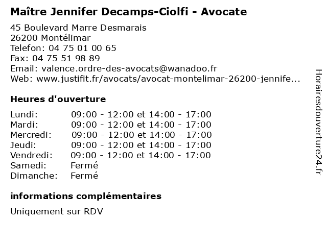 1 Jennifer pautrat - Psychologue (Distance: 7,46 km) 84 Route de Crest, 26740 Sauzet jennifer, pautrat, psy, psychiatre, psychologue, sante, soins 2 Trenois Decamps (Distance: 39,20 km) 45 Avenue de Marseille, 26000 Valence agences, decamps, matériaux, quincaillerie, travaux, trenois 3 Dr Jennifer Hampton - Angiologue (Distance: 45,80 km) 14 Rue Jean Nouguier, 30200 Bagnols-sur-Cèze angiologie, angiologue, dr, hampton, jennifer, vaisseaux, vasculaire 4 Dr Jennifer Hampton - Médecin généraliste (Distance: 46,74 km) - avenue Alphonse Daudet, 30205 Bagnols-sur-Cèze arthere, chirurgien, corronere, dr, généraliste, hampton, jennifer, médecin, médecine, vasculaire 5 Maître Ludovic Daloz - Avocat (Distance: 0,03 km) 45 Boulevard Marre Desmarais, 26200 Montélimar avocat, avocate, avocats, civils, daloz, droits, juridiques, ludovic, maître 6 Maître Isabelle Ceyte - Avocate (Distance: 0,03 km) 45 Boulevard Marre Desmarais, 26200 Montélimar avocate, avocats, ceyte, civils, droits, isabelle, juridiques, maître |