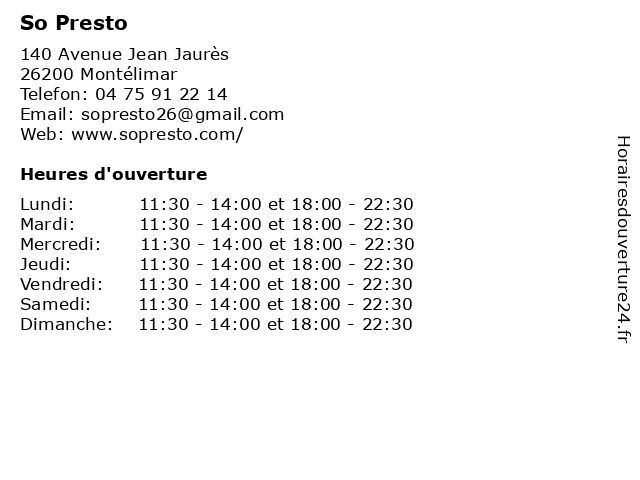 | Mardi | 11:30-14:00 et 18:00-22:30 |