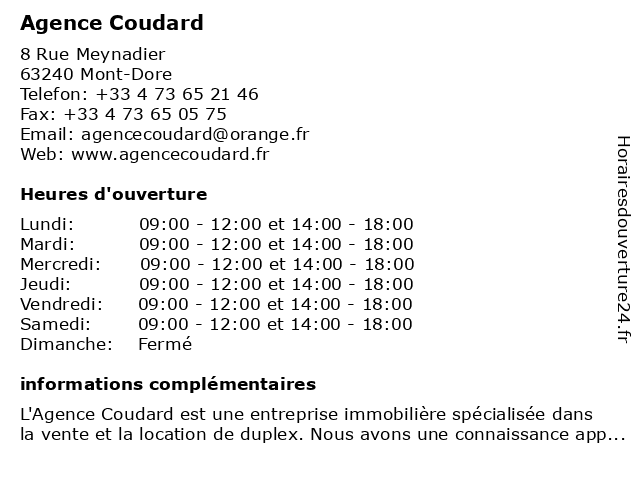 1 Agence Immobilière Coudard (Distance: 5,93 km) 60 Place de la Victoire, 63150 La Bourboule agence, coudard, immobilière |