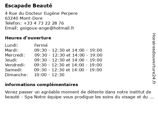| Samedi | 09:30-12:30 et 14:00-19:00 |