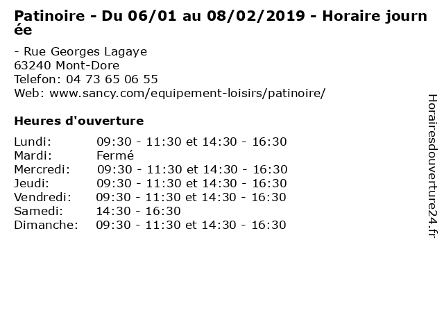 1 Patinoire - Du 06/01 au 08/02/2019 - Horaire soirée (Distance: 0,00 km) - Rue Georges Lagaye, 63240 Mont-Dore 06/01, 08/02/2019, au, du, famille, glace, glisse, horaire, loisirs, patin, patinoire, soirée, sport 2 Patinoire - Du 22/12/2018 au 05/01/2019 - Horaire journée (Distance: 0,00 km) - Rue Georges Lagaye, 63240 Mont-Dore 05/01/2019, 22/12/2018, au, du, famille, glace, glisse, horaire, journée, loisirs, patin, patinoire, sport 3 Patinoire - Du 22/12/2018 au 05/01/2019 - Horaire soirée (Distance: 0,00 km) - Rue Georges Lagaye, 63240 Mont-Dore 05/01/2019, 22/12/2018, au, du, famille, glace, glisse, horaire, loisirs, patin, patinoire, soirée, sport 4 Office de Tourisme - Du 01/09 au 30/09 (Distance: 10,38 km) - Rue de Jassaguet, 63790 Murol 01/09, 30/09, au, de, du, horaires des musées, office, restaurants, tourisme, transports 5 Office de Tourisme - Du 01/10 au 02/11 (Distance: 10,38 km) - Rue de Jassaguet, 63790 Murol 01/10, 02/11, au, de, du, horaires des musées, office, restaurants, tourisme, transports 6 France Pare Brise (Distance: 32,61 km) 112 Boulevard Gustave Flaubert, 63000 Clermont-Ferrand bris de glace, brise, france, pare, services |