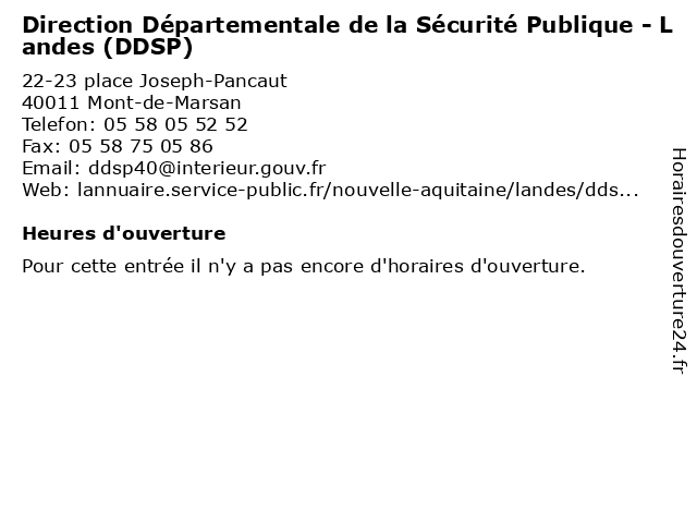 Termes de recherche pour Direction Départementale de la Sécurité Publique - Landes (DDSP):la, de, administration, services, landes, direction, securite, publics, départementale, publique, ddsp, organismes |