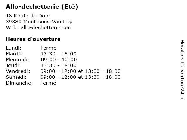 1 Allo-dechetterie (Eté) (Distance: 13,76 km) - Rue Coste et Bellonte, 39100 Dole allo, dechetterie, eté, gravats, huiles usées, la réception des déchets et écocentres, les appareils électroménagers, les déchets verts, papier et carton en quantité 2 Allo-dechetterie (Eté) (Distance: 14,19 km) - Le Deschaux, 39120 Chaussin allo, dechetterie, eté, gravats, huiles usées, la réception des déchets et écocentres, les appareils électroménagers, les déchets verts, papier et carton en quantité 3 Allo-dechetterie (Eté) (Distance: 14,41 km) - de l'Ethole, 39600 Arbois allo, dechetterie, eté, gravats, huiles usées, la réception des déchets et écocentres, les appareils électroménagers, les déchets verts, papier et carton en quantité 4 Allo-dechetterie (Eté) (Distance: 17,64 km) - Rue Aiguillage, 39230 Chaumergy allo, dechetterie, eté, gravats, huiles usées, la réception des déchets et écocentres, les appareils électroménagers, les déchets verts, papier et carton en quantité 5 Allo-dechetterie (Hiver) (Distance: 0,00 km) 18 Route de Dole, 39380 Mont-sous-Vaudrey allo, dechetterie, gravats, hiver, huiles usées, la réception des déchets et écocentres, les appareils électroménagers, les déchets verts, papier et carton en quantité 6 Déchèterie - Eté (25 Mars au 13 Octobre) (Distance: 11,82 km) - Rue du Val d'Amour, 39600 Villers-Farlay 13, 25, au, déchèterie, eté, gravats, huiles usées, la réception des déchets et écocentres, les appareils électroménagers, les déchets verts, mars, octobre, papier et carton en quantité, été |