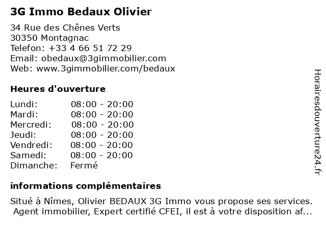 1 3G Immo Consultant (Distance: 0,01 km) 34 rue des chênes verts, 30350 Montagnac 3g, achats, agence, consultant, consultants, immo, immobilier, ventes 3 Snack Bar l'Olivier (Distance: 13,64 km) Snack Bar l Olivier, 30190 Saint Genies De Malgoires bar, cyril, olivier, panier, restaurants, snack 4 Pharmacie de l'Olivier (Distance: 16,69 km) 18 Route d'Alès, 30140 Bagard de, homéopathie, l', l'olivier, médicaments, olivier, orthopédie, parapharmacie, pharmacie 5 Olivier Valerie (Distance: 17,11 km) Batiment d, 30380 Saint Christol Les Ales olivier, restaurants, valerie 6 Mon Chasseur Immo - Elodie M. (Distance: 17,33 km) 123 Impasse de la Margeride, 30000 Nîmes chasseur, elodie, immo, m., mon |