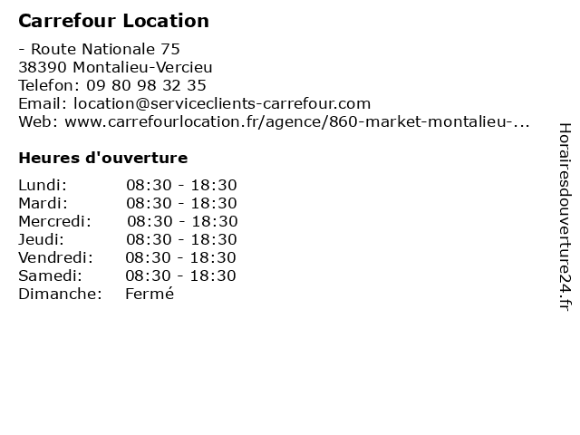 1 Carrefour Location (Distance: 9,25 km) - Rue Alexandre Berard, 01500 Amberieu-en-Bugey automobiles, carrefour, déménagements, location, market, véhicules 2 Carrefour Location (Distance: 18,71 km) 672 Chemin de la Gare, 38460 Crémieu agence, carrefour, location, utilitaires, véhicules 3 Carrefour Location (Distance: 19,74 km) - Rue des Aubépines, 38230 Pont-de-Chéruy agence, carrefour, location, utilitaires, véhicules 4 Carrefour Market (Distance: 0,00 km) - Route Nationale 75, 38390 Montalieu Vercieu alimentation, carrefour, magasin discount, market, supermarché 5 Carrefour Drive (Distance: 0,00 km) - Route Nationale 75, 38390 Montalieu-Vercieu carrefour, drive, hypermarche, marche, market 6 Carrefour Station Service (Distance: 3,11 km) 8 Rue De L'industrie, 01150 Lagnieu automobiles, carrefour, oil, service, services, station, stations essences |