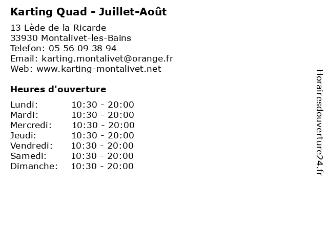 1 Karting Montalivet (Distance: 0,01 km) Route de Vendays, 33930 Vendays-Montalivet karting, montalivet 2 Camping Le Merin - Juillet et Août (Distance: 2,06 km) 7 route du Mérin, 33930 Vendays-Montalivet accueil, août, camping, et, juillet, juillet/aout, le, loisirs, merin, tourisme, vacances 3 Centre Equestre Les Petits Chevaux - juillet et août (Distance: 11,46 km) 1 Le Franc-Tireur, 33780 Soulac-sur-Mer août, centre, chevaux, club, equestre, equitation, et, juillet, les, petits, sport, sportif, sports 4 Camping Des Pins - Réception Juillet et Août (Distance: 12,03 km) 213 passe de Formose, 33780 Soulac-sur-Mer août, camping, des, et, juillet, loisirs, pins, réception, tourisme, vacances 5 Alain Joaillier (Juillet et Août) (Distance: 28,48 km) 27 rue Gambetta, 17200 Royan accessoires, alain, août, bijouterie, bijoux, et, joaillier, juillet 6 Institut Mahler (Juillet et Août) (Distance: 29,01 km) 5 avenue Daniel Hedde, 17200 Royan août, beauté, et, institut, juillet, mahler |