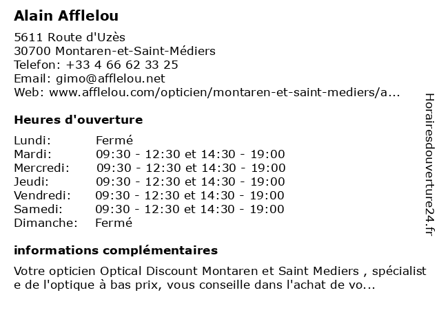 1 Opticien Montaren-Et-Saint-Médiers | Alain Afflelou (Distance: 0,00 km) 5611 Route D'uzès, 30700 Montaren-Et-Saint-Médiers afflelou, alain, et, magasin de lunettes de soleil, magasin d’accessoires de mode, montaren, médiers, opticien, optométrie, saint 2 Suzanna Florent Alain (Distance: 2,02 km) Quartier Mayac, 30700 Uzes alain, florent, restaurants, suzanna 3 Les jardins d'Alain SASU (Distance: 2,11 km) 8 Rue Edgar Degas, 30700 Uzès d'alain, jardins, les, sasu 5 Opticien La Calmette Alain Afflelou (Distance: 15,40 km) Avenue Charles de Gaulle, 30190 La Calmette afflelou, alain, calmette, la, opticien 6 Audioprothésiste La Calmette-Alain Afflelou Acousticien (Distance: 15,43 km) Zone Commerciale La Carbonnière, 30190 La Calmette acousticien, afflelou, alain, audiologie, audioprothésiste, calmette, clinique médicale, la |
