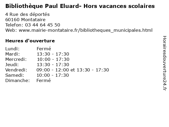 1 Bibliothèque Paul Eluard - petites vacances (Distance: 0,04 km) 4 Rue des déportés, 60160 Montataire bibliothèque, cd audio, cd.rom, eluard, horaires, livres, paul, petites, revues, vacances 2 Bibliothèque Paul Eluard - grandes vacances (Distance: 0,04 km) 4 Rue des déportés, 60160 Montataire bibliothèque, cd audio, cd.rom, eluard, grandes, horaires, livres, paul, revues, vacances 3 Piscine intercommunale de Montataire - Périodes scolaires (Distance: 0,58 km) 35 Rue Anatole France, 60160 Montataire aqua, aquatique, de, intercommunale, montataire, piscine, périodes, scolaires 4 École Élèmentaire Publique - Paul Langevin (Distance: 1,12 km) 19 Rue du 8 Mai 1945, 60160 Montataire ecole, education, langevin, paul, publique, services, école, élèmentaire 5 École Maternelle Publique - Paul Langevin (Distance: 1,12 km) 19 Rue du 8 Mai 1945, 60160 Montataire ecole, education, langevin, maternelle, paul, publique, services, école 6 Bibliothèque Elsa Triolet - Hors vacances scolaires (Distance: 1,12 km) 92 Avenue Anatole France, 60160 Montataire bibliothèque, cd audio, cd.rom, elsa, hors, livres, revues, scolaires, triolet, vacances |