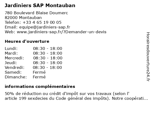 1 Jardiniers SAP Montauban (Distance: 1,54 km) 130 Avenue Marceau Hamecher, 82000 Montauban jardiniers, montauban, sap 2 Jardiniers SAP Montauban (Distance: 4,69 km) 2410 Route d'Auch, 82000 Montauban jardiniers, montauban, sap 3 Jardiniers SAP Bressols (Distance: 10,56 km) 1446 Chemin de Cauty, 82710 Bressols bressols, jardiniers, sap 4 Jardiniers SAP Montech (Distance: 11,26 km) 11 Avenue de la Mouscane, 82700 Montech jardiniers, montech, sap 5 Jardiniers SAP Varennes (Distance: 16,13 km) 459 Route de Puylauron, 82370 Varennes jardiniers, sap, varennes 6 Jardiniers SAP Lafrancaise (Distance: 18,37 km) 80 Chemin De Capgras, 82130 Lafrançaise jardiniers, lafrancaise, sap |